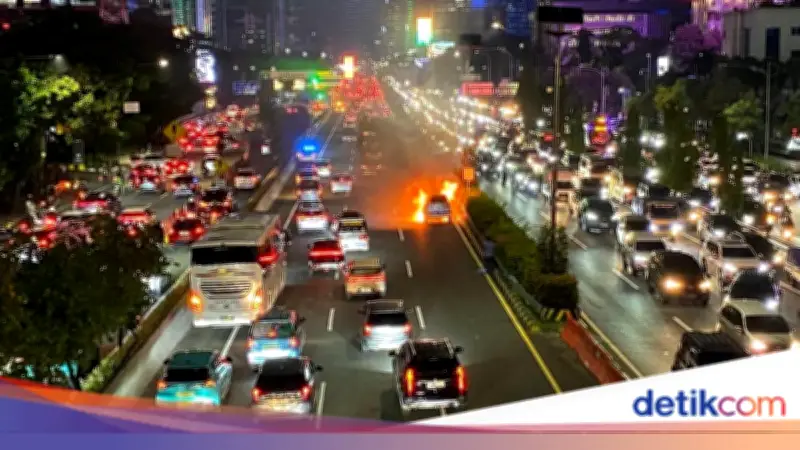 Jakarta - Satu unit mobil terbakar di Tol Dalam Kota (Dalkot) arah Cawang pada Selasa malam, 28 April 2026. Peristiwa ini menyebabkan arus lalu lintas di sekitar lokasi mengalami kemacetan parah.