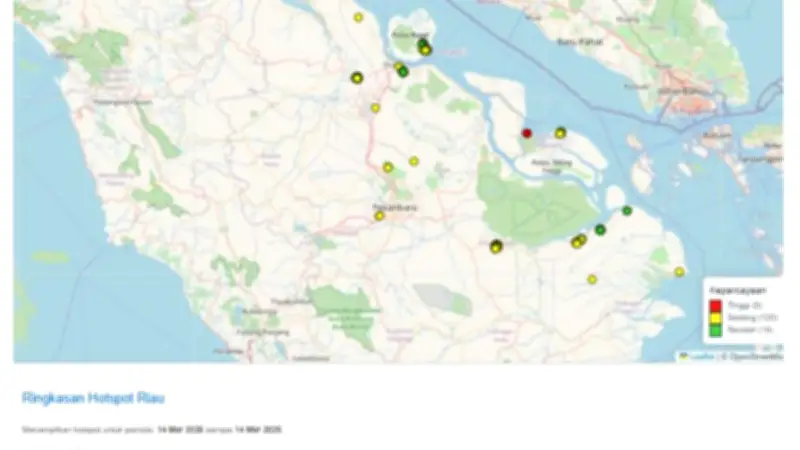 Badan Meteorologi, Klimatologi, dan Geofisika (BMKG) Stasiun Pekanbaru telah mendeteksi sebanyak 143 titik panas di Provinsi Riau. Data yang diperbarui hingga Sabtu (14/3/2026) pukul 23.00 WIB ini menunjukkan bahwa Kabupaten Pelalawan menjadi wilayah dengan jumlah titik panas tertinggi, mencapai 49 titik.