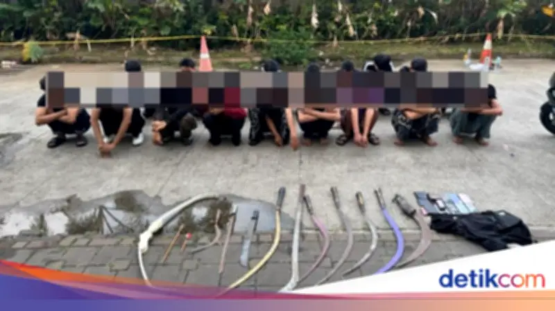 Barang bukti yang disita antara lain sepuluh senjata tajam jenis celurit dan golok panjang, serta busur dan ponsel milik para remaja. Foto yang diterima menunjukkan para remaja tertunduk di samping barang bukti tersebut.