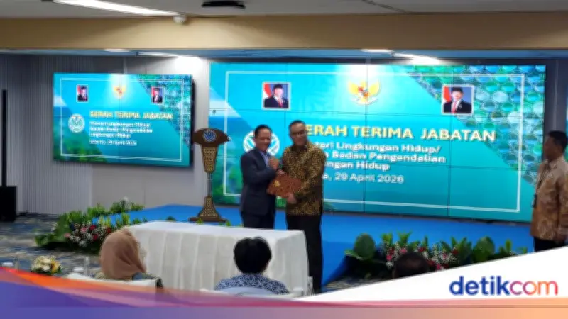 Acara serah terima jabatan (sertijab) digelar di gedung Kementerian LH, Kuningan, Jakarta Selatan, pada Rabu (29/4/2026). Sertijab tersebut dihadiri oleh sejumlah pegawai di lingkungan Kementerian LH.